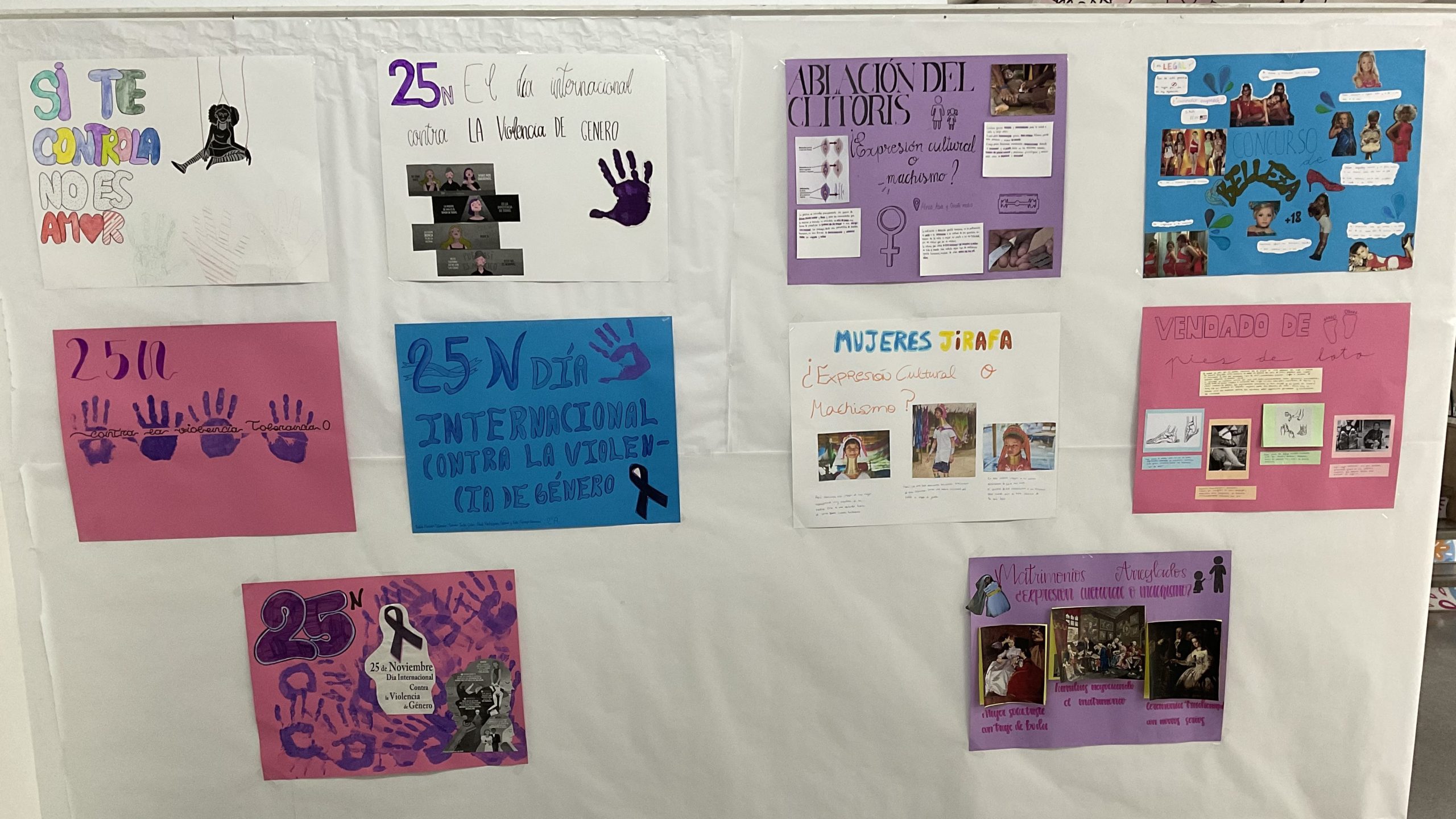 Finalmente, desde el Departamento de Filosofía se han impulsado distintas iniciativas que completan este recorrido. Los grupos de Valores Éticos de 2.º de ESO han elaborado murales dedicados a este día, reflexionando sobre la importancia del respeto y la igualdad; mientras que el alumnado de Antropología y Sociología de 1.º de Bachillerato ha creado carteles bajo el lema “¿Expresión cultural o machismo?”, expuestos frente al mural principal para invitar a la reflexión de toda la comunidad educativa.